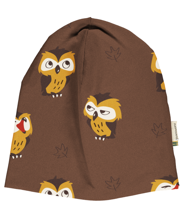 A warmer, cosier hat for colder weather. This double-layered hat has a layer of printed organic cotton jersey on the outside and a contrasting layer of sweat fabric on the inside.