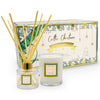 The set includes one 200g aromapot tumbler candle poured from 100% plant wax from a blend of soy, palm and rapeseed oil with no petrol-chemicals or sulphates and a 100g diffuser made with the finest natural essential oils. The candle has a clean burn with no waste and a burn time of up to 45 hours; the diffuser oil release time is up to 4 months. Reeds are included. All products are made in Ireland using recycled glass and sustainable packaging.